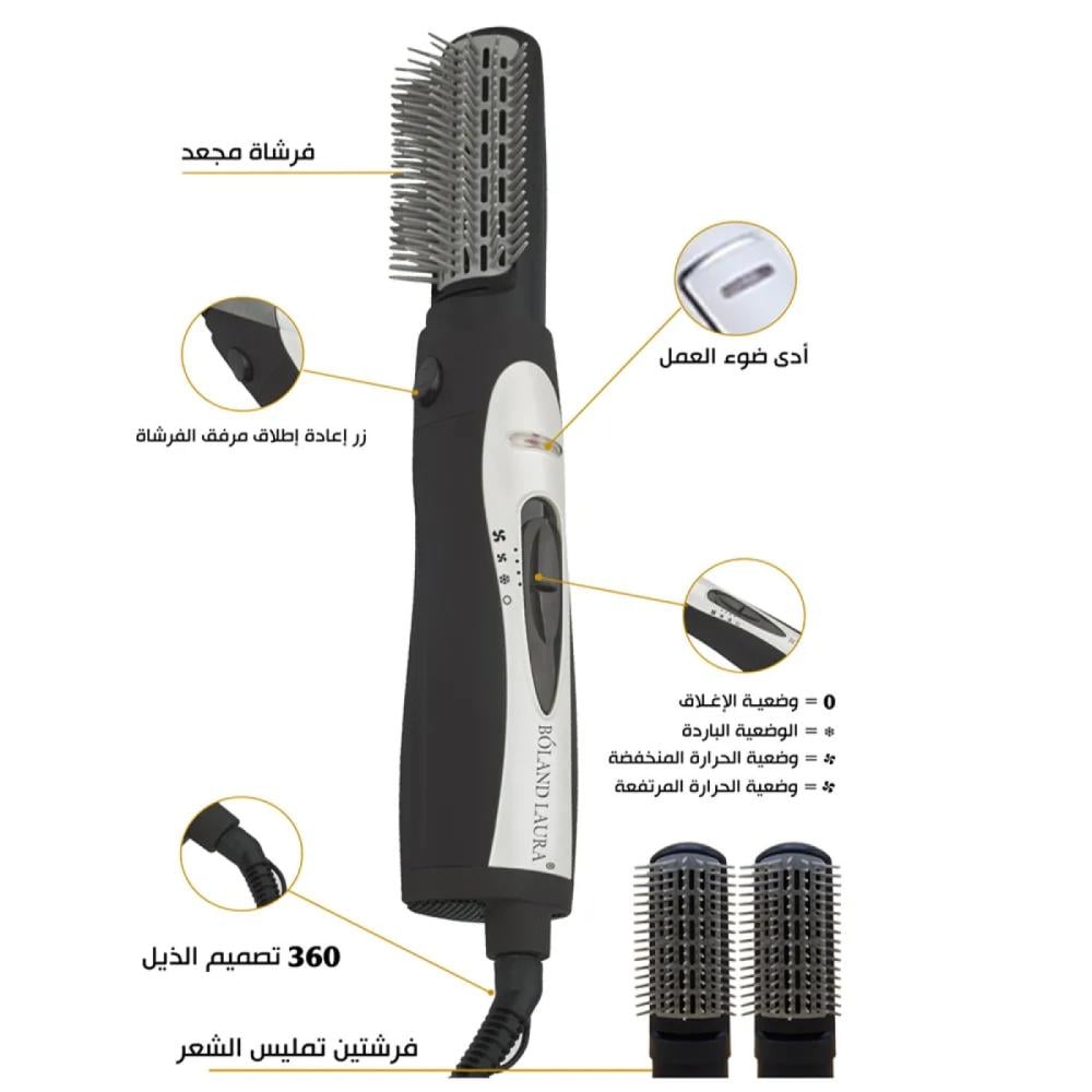 • مقبض بطبقة مزدوجة لحماية يدك من الحرق مع فرشاة الهواء الساخن التي تدور دورة كاملة 360 درجة مما يجعل تصفيف الشعر أسهل .
